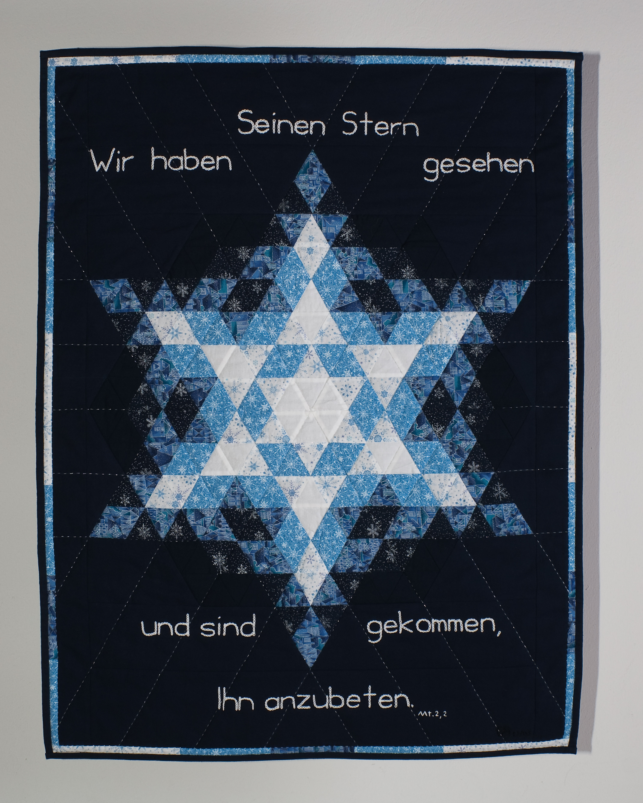 Der gestickte Bibelvers: "Wir haben Seinen Stern gesehen und sind gekommen, Ihn anzubeten..." ist ein Zitat (Matthäus 2,2) aus dem Mund der Weisen aus dem Morgenland, die den neugeborenen König der Juden suchten.