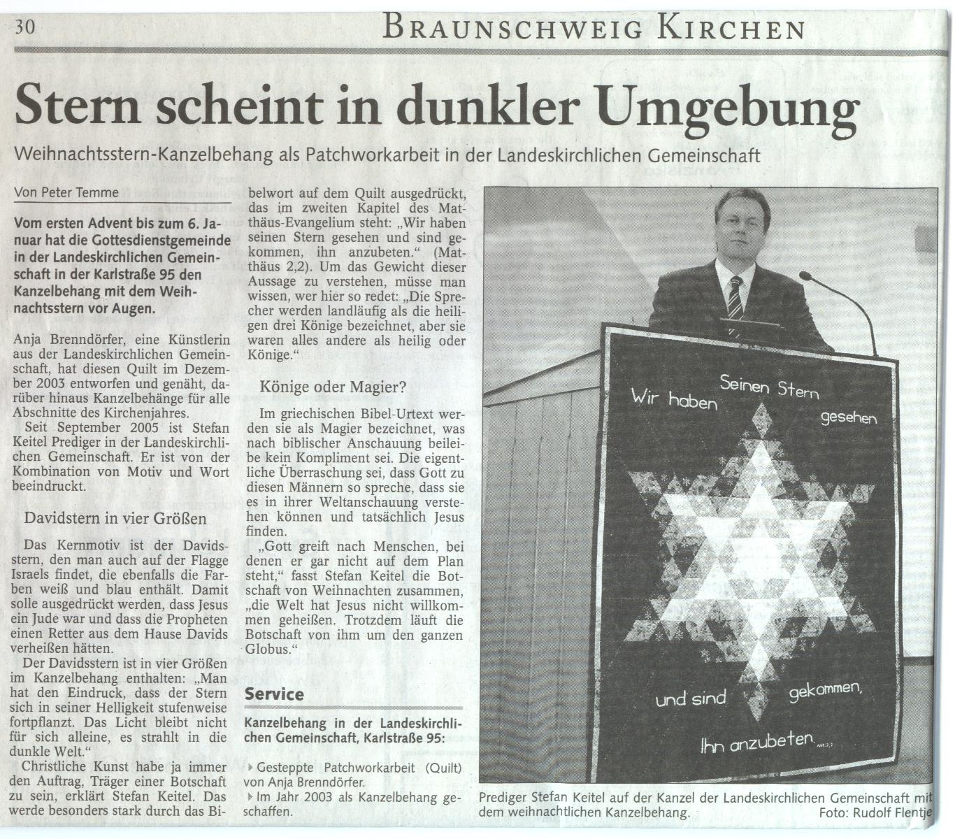 Ihren damaligen Theorien folgend schlossen sie, dass ein ganz besonderer, neuer König im Volk der Juden geboren sein musste. An diesen Gedanken anknüpfend, ist im Stern des Kanzelbehangs in 4 verschiedenen Größen der Davidsstern erkennbar.