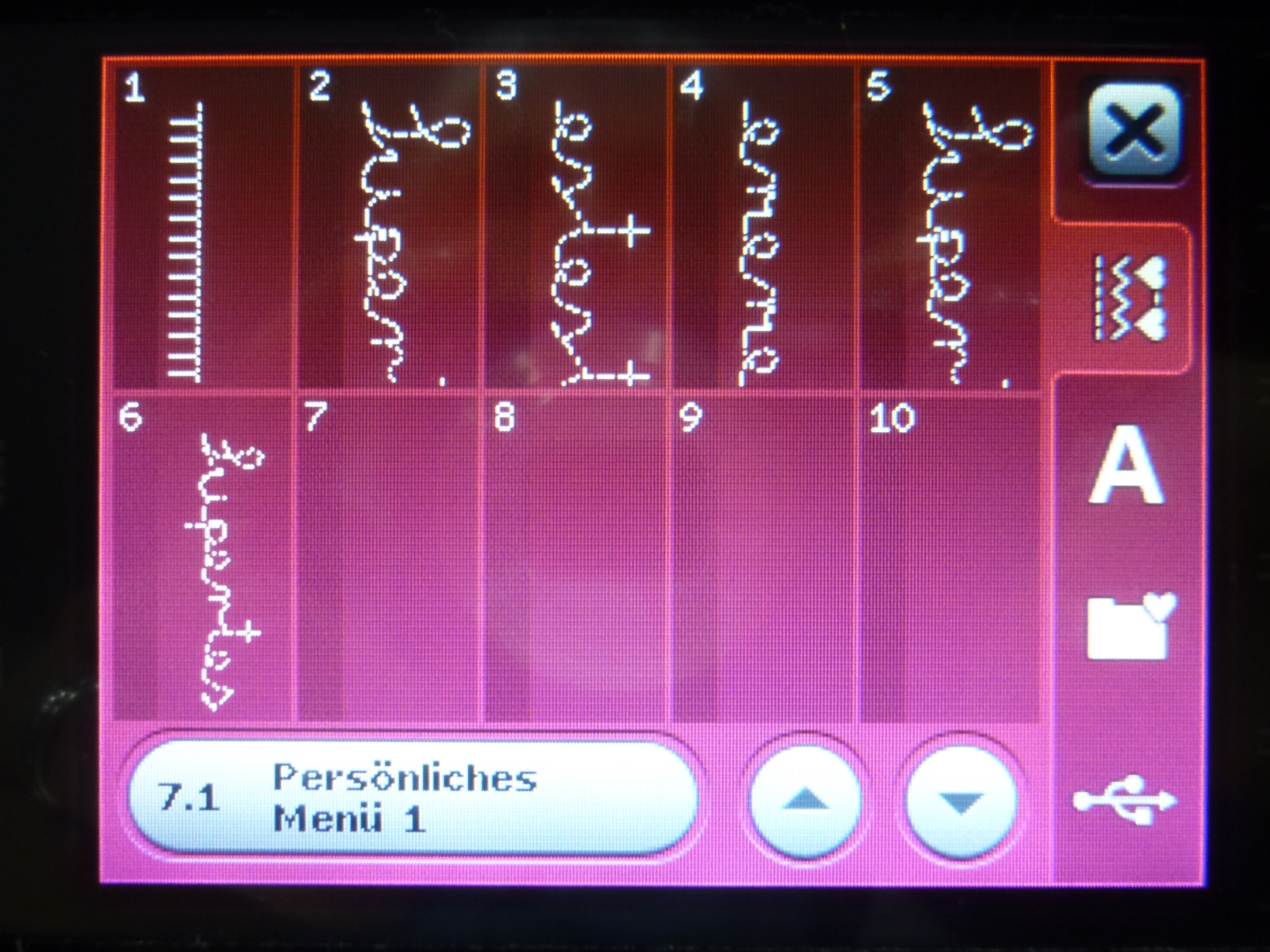 Nun konnte ich den fertigen Schriftzug unter 7.1.6 speichern und mit der Einzelmusterfunktion und der aktivierten Vernäh-, Schnitt- und Stop-Funktion genau einmal sticken lassen.