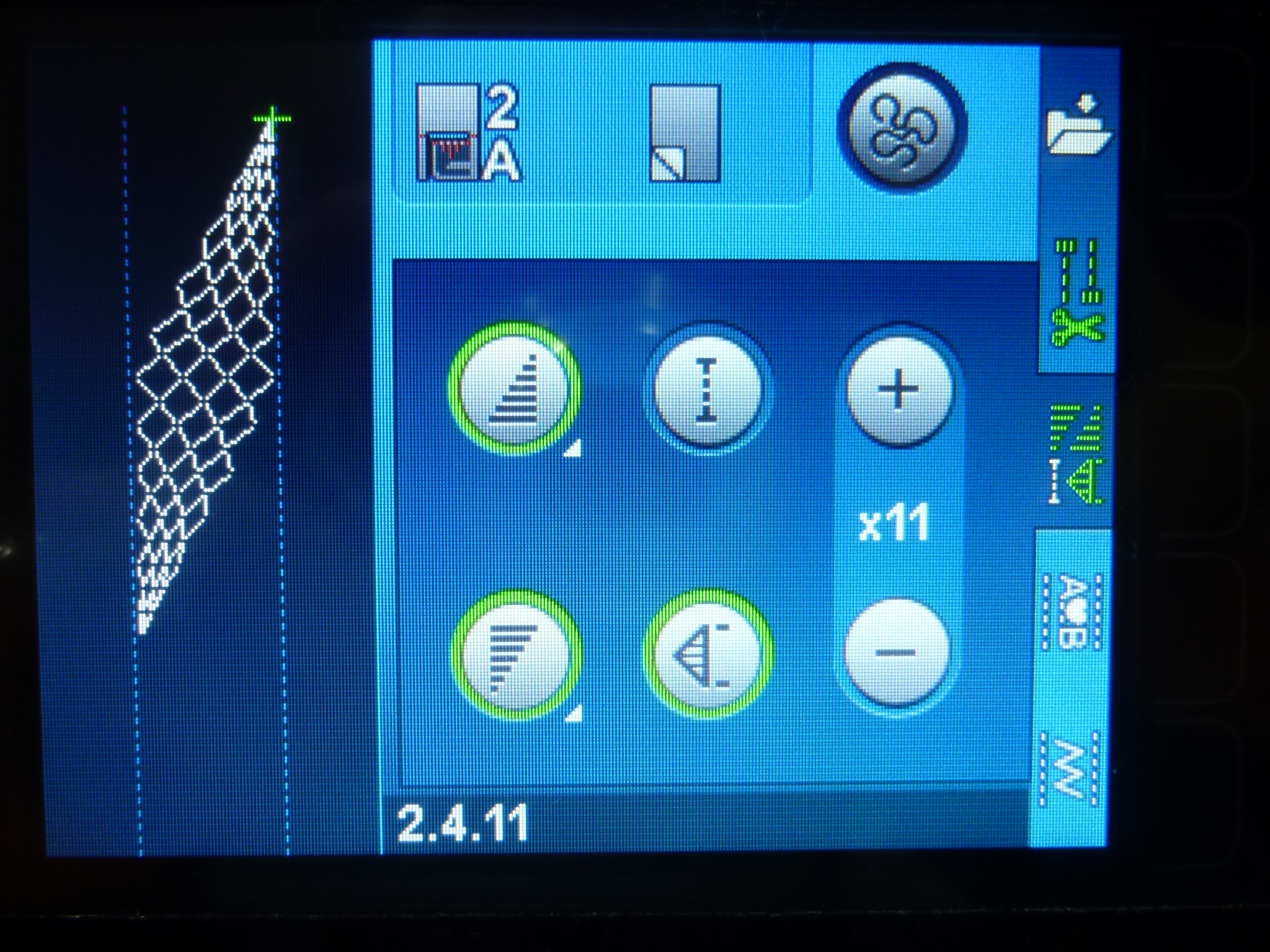 Das Signal, wann mit dem schmaler werden begonnen werden soll, gibt man durch Antippen der Rückwärtsnähtaste. Das wieder breiter werden passiert beim Weiternähen von allein, wenn man es vorher so eingegeben hat.