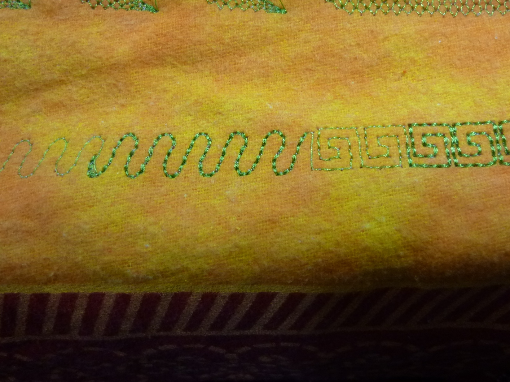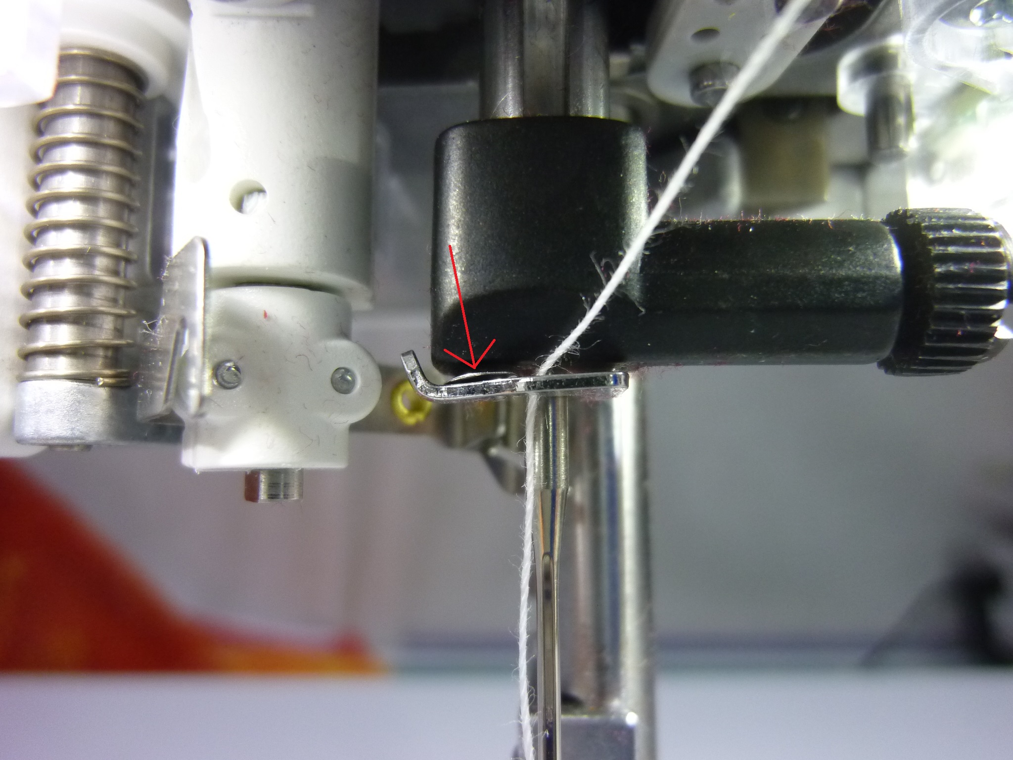 Z.B. hatte ich zu Beginn große Schwierigkeiten, die letzte Fadenführungsöse vor der Nadel einzufädeln. Der Faden hing immer links fest und wollte nicht in die Mitte der Öse rutschen, wie ich es gewohnt war. Bis ich ihn endlich an die richtige Stelle gezwungen hatte, war der Faden leicht beschädigt oder sogar gerissen (30er Rayonstickgarn, also dickeres als normalerweise). Erst ärgerte ich mich und meinte, es sei eine fehlerhafte, scharfkantige Öse angebracht worden, bis ich mir (nach 3 Tagen!) die Mühe machte, die Stelle genau zu untersuchen. Bei meinen Maschinen ist die entsprechende Öse nur ein einfacher waagerechter Haken, in den der Faden von links reingeschoben wird, und aus der er auch manchmal wieder herausspringt, was nicht besonders hilfreich für das Nähen ist. Jetzt wurde parallel zum Haken ein flaches Metallfederblättchen angefügt, das das Wiederherausspringen verhindert, dafür aber ein klein wenig mehr Beachtung beim Einfädeln erfordert.